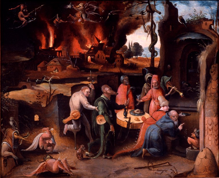 De nieuwe muurschildering is geïnspireerd op een schilderij van Jan Mandijn. Hij was in de 16de eeuw succesvol met Jheronimus Bosch-achtige taferelen vol duivels en heksen. Het thema van dit werk? De verzoeking van de heilige Antonius! Antonius, de man in het blauw, trok zich volgens de legende van Athanasius van Alexandrië terug in de woestijn om zich te bezinnen. Hij werd keer op keer op de proef gesteld door demonen en monsters en weerstond allerlei verleidingen. Deze eeuwenoude strijd tegen verleidingen steekt Studio Giftig in een modern jasje.